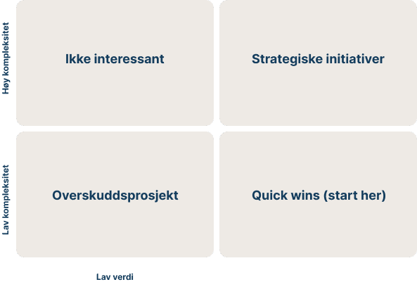 Du har nå identifisert initiativer som gir effekt og forretningsverdi, og har et tydelig signal på hvor du bør starte (quick wins).
