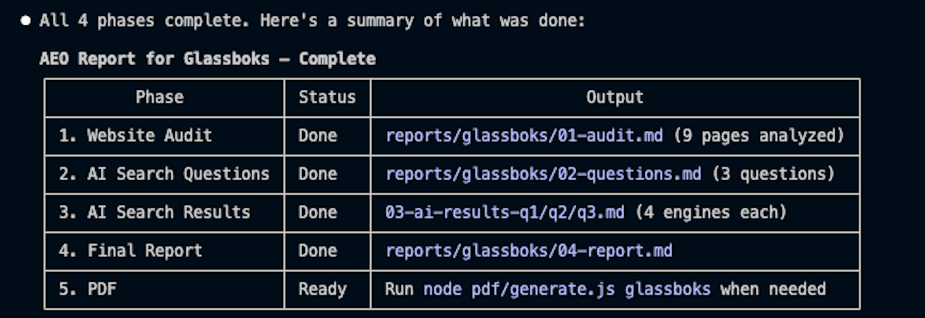 5. Ferdig rapport. Alt samles i en sluttanalyse. Workflowen produserer rapporten i markdown, og kjører et script som genererer en ferdig PDF. Designmalen? Også den laget med Claude Code.