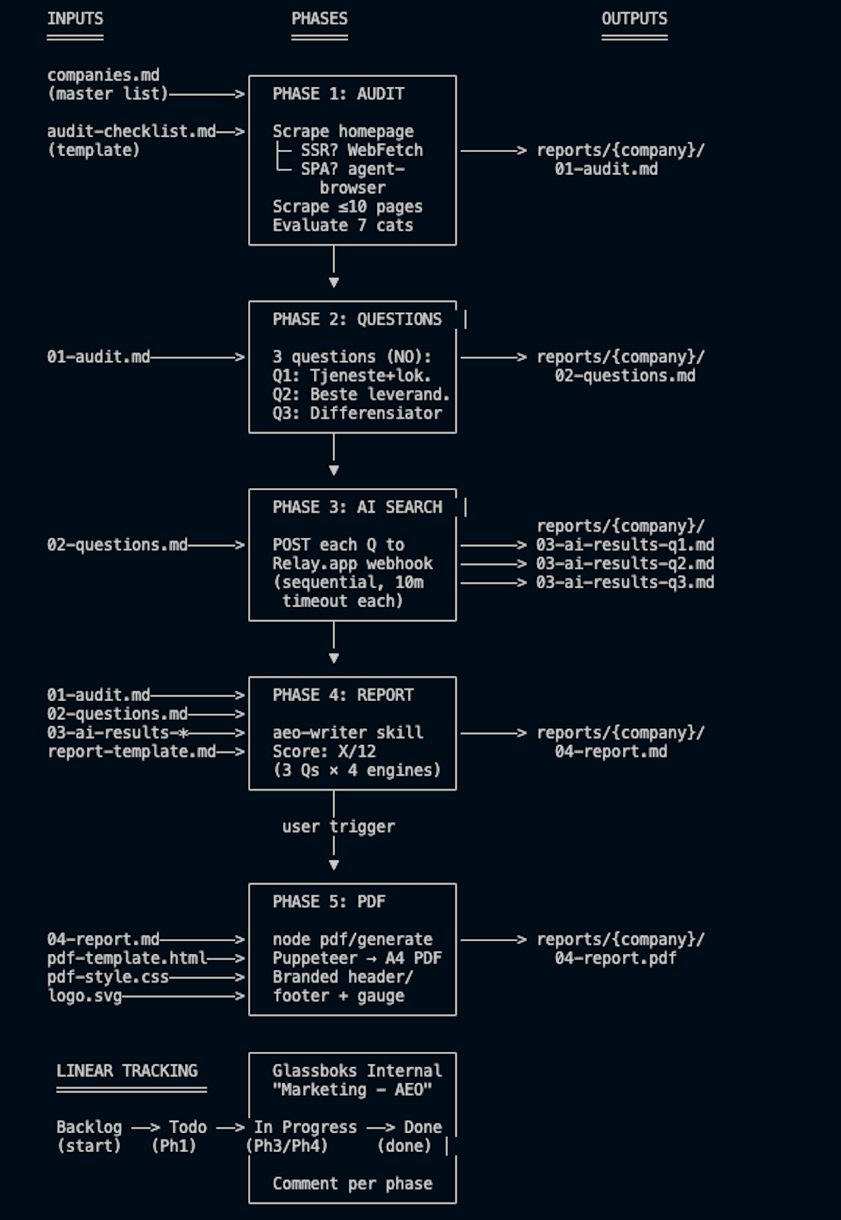 Arbeidsflyten har tilgang til et relay-verktøy som sender hvert spørsmål til ChatGPT, Perplexity, Claude og Gemini samtidig. Fire motorer, samme spørsmål, rå resultater tilbake.